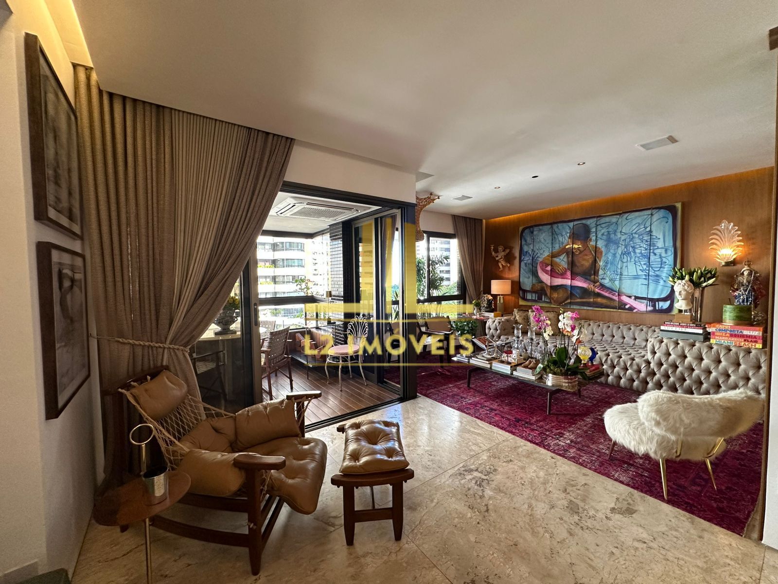 A sala ampla e integrada, dividida em três ambientes, conta com piso em mármore, teto rebaixado em gesso, projeto de iluminação e som e ventilação cruzada, A varanda com fechamento em Reiki abriga uma área gourmet equipada com bancada em granito inteiriço e cooktop.