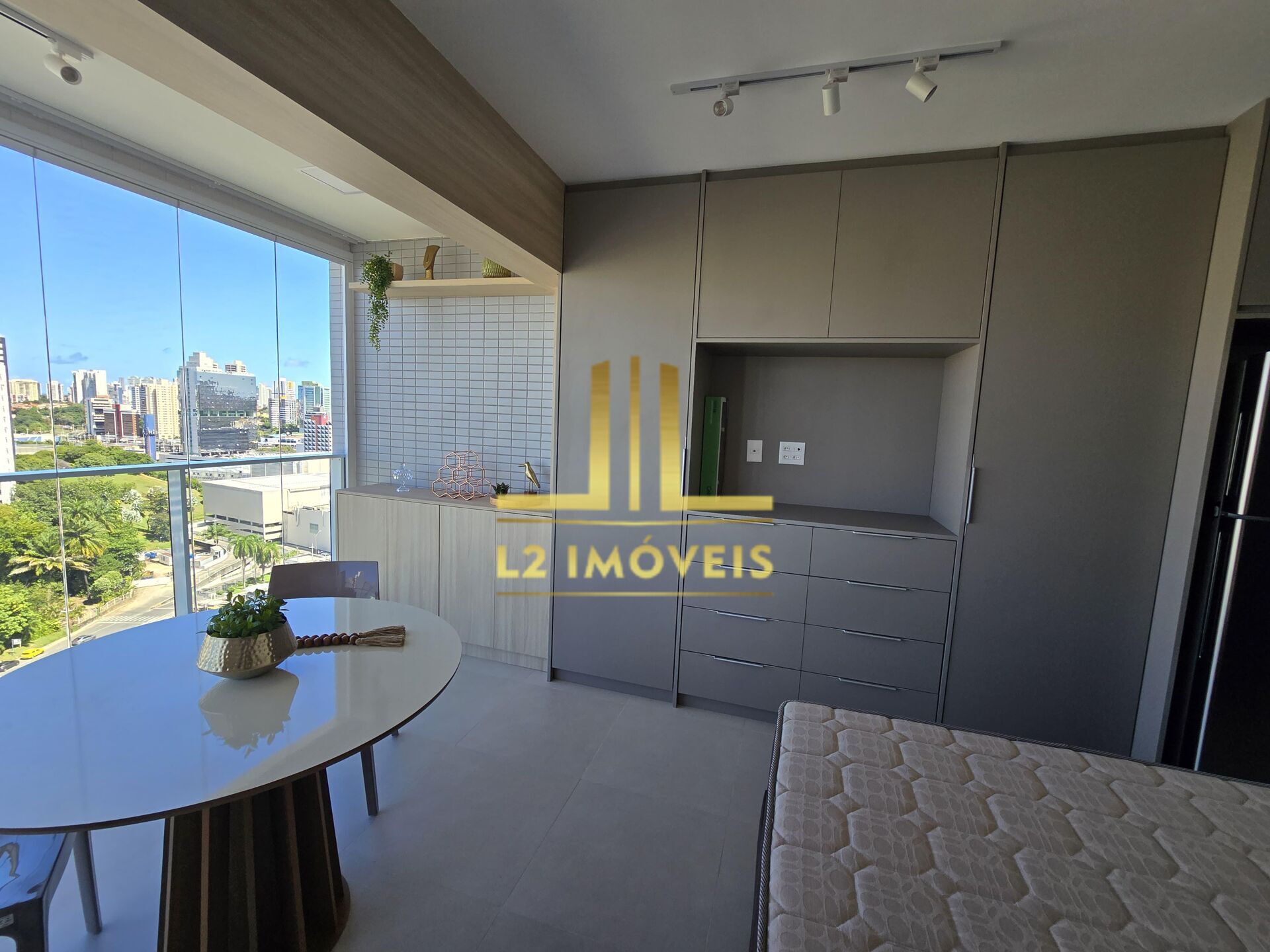 1/4, 30m2, nascente total, andar alto, imóvel novo e nunca habitado com móveis e utensílios domésticos de alto padrão como: eletrodomésticos: geladeira electrolux inverter inox, ar samsung 18.000 btus, TV 55 polegadas TCL inox, máquina lava e seca LG 12 kgs inox, cooktop oster 2 bocas e forno eletrico Electrolux inox 220V - 80 litros o maior/ micro-ondas inox electrolux 23L, conjunto mesa e 3 cadeiras tramontinas Alice, cama box baú ortobom pro saúde do modelo topo de linha. Além do conjunto de pratos/copos e Talheres Tramontina.