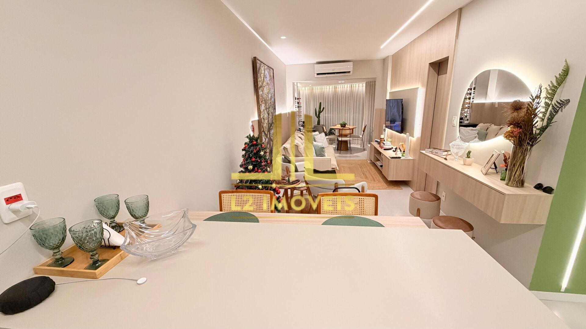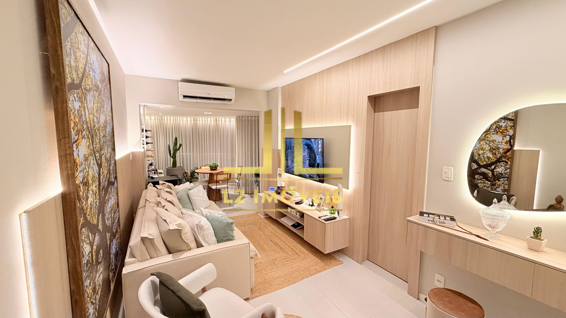 O apartamento conta com armários embutidos, ar-condicionado na sala e no quarto, teto rebaixado em gesso, projeto de iluminação rico em detalhes, fechamento de varanda em Reiki e cortinas sob medida. Um projeto contemporâneo e funcional, assinado pelo Projeto OLIVA, com reconhecimento em premiação CASACOR, destacando estética, elegância e aproveitamento inteligente dos espaços.