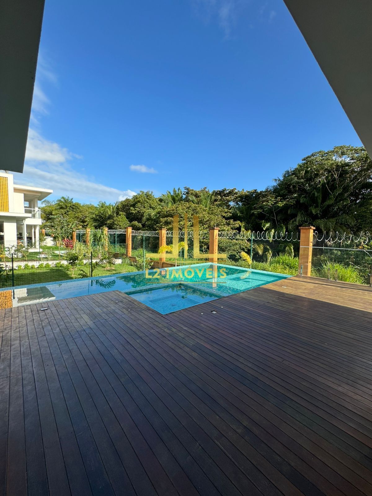 - Pavimento térreo com lavabo interno e externo, suíte reversível, espaço gourmet com deck em cumaru, piscina com borda infinita, prainha e hidromassagem em pastilha de porcelana Loulé com LED